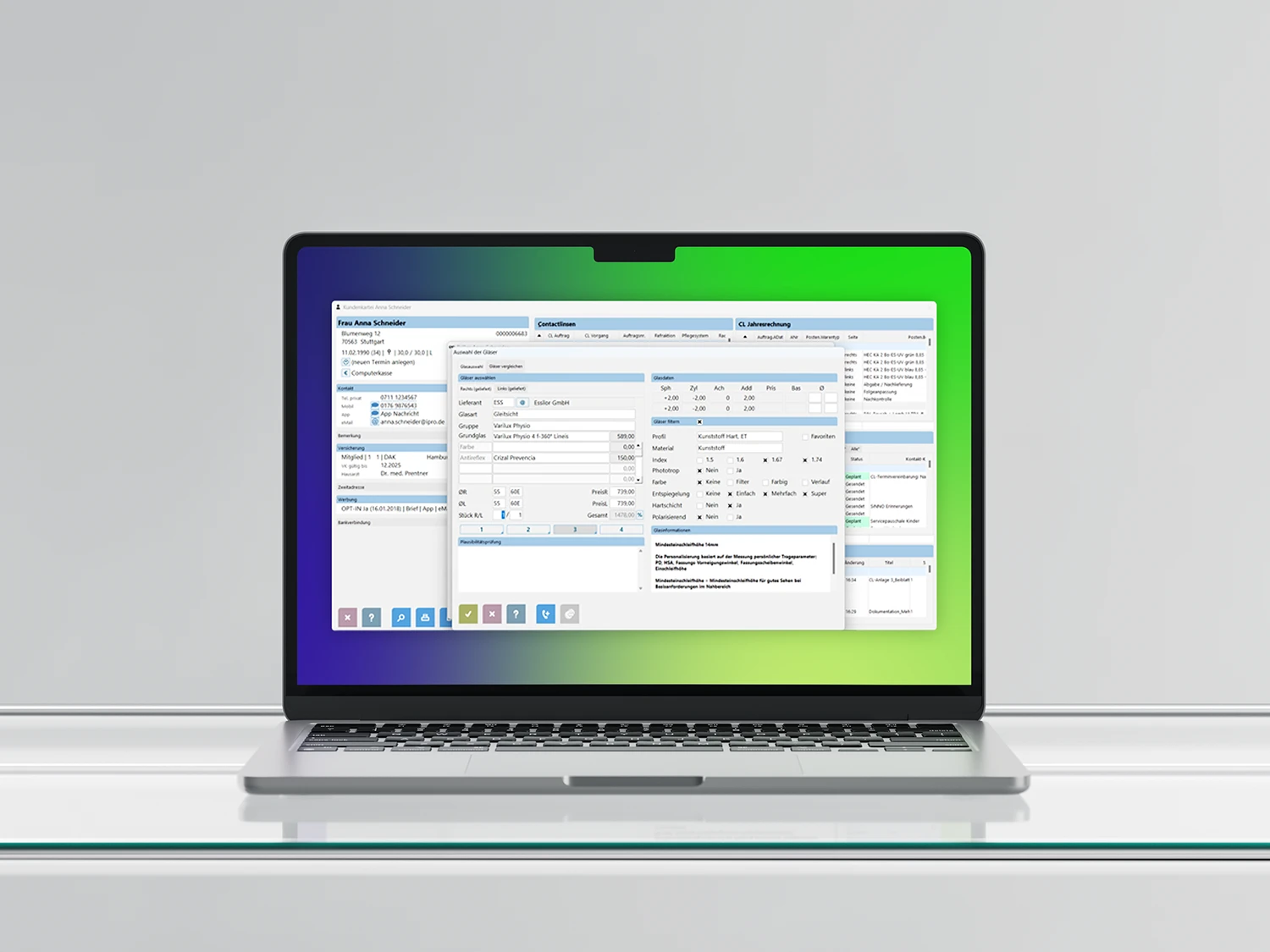 Glasberatung, Kontaktlinsen, Bestellungen, Inventuren, Kataloge, Geräteschnittstellen. Alles, was das Arbeiten angenehm macht, ist bei Ipro Standard.